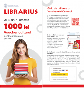 Vești bune pentru tinerii din Republica Moldova! Persoanele care împlinesc 18 ani vor intra în posesia unui voucher cultural în sumă de 1000 de lei, care poate fi valorificat pe librarius.md. Pentru a beneficia de VOUCHERUL CULTURAL este nevoie să dețineți SEMNĂTURA ELECTRONICĂ (mobilă) pentru a vă autentifica pe pagina de plăți electronice mpay.gov.md, prin intermediul căreia va fi efectuată plata pentru cărțile dorite.