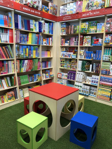 Sala pentru copii este situată în capătul librăriei, ceea ce oferă o posibilitate părinților să-și aleagă cartea preferată până ce copilul său desenează în sala de literature pentru copii.