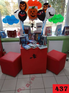 Они, в свою очередь, проявили особую фантазию: паутины, кровавые отпечатки на полу, разрисованные апельсины, летучие мыши и призраки вырезанные из цветной бумаги, разрисованные тыквы .... и что самое важное, подборка книг – ужасы, детективы и триллеры !!!